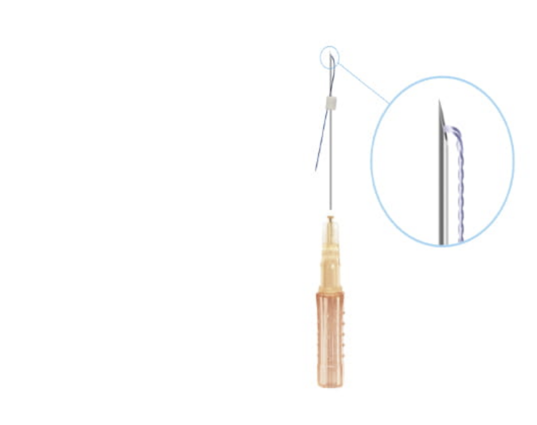 Sterile, reabsorbable, tornado-screw polydioxanone medical suture with sterile hypodermic cannula intended for single use.